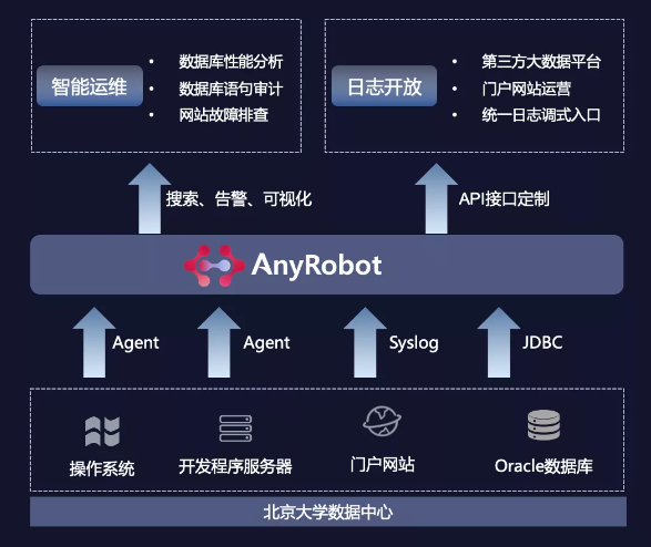此外,基于AnyRobot的统一日志管理和实时分析能力,北京大学IT运维人员可以实现对于IT基础设施和校内应用系统的实时监控,精准及时告警,故障根源分析,提升IT运维效率。