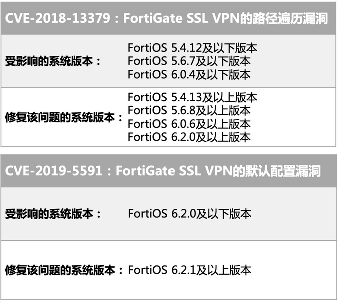 如下的三个漏洞是历史漏洞,Fortinet在2019年和2020年已经在官方漏洞发布网站https://fortiguard.com/psirt公布了漏洞信息、临时解决方案和永久修复方案: