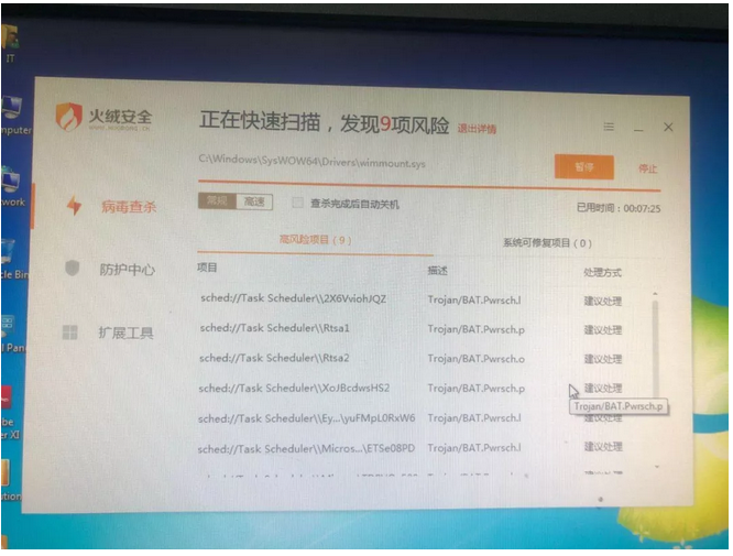 对此挖矿,只需要部署火绒进行快速扫描,并重启终端即可,在重启后可选择全盘扫描或自定义扫描,处理C盘内的病毒残留文件。