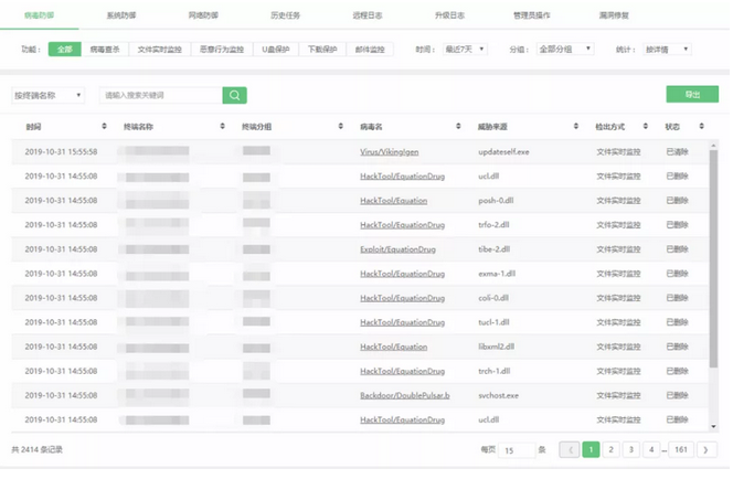 控制中心平台管理:要求控制中心支持直观的展示终端信息、病毒趋势统计、病毒类型排行、病毒排行、终端危险排行等全网统计情况。并随时对网络中威胁发生的情况进行查询,能组合时间、IP、机器名、病毒名称、病毒类型等信息全方位定位、展示。