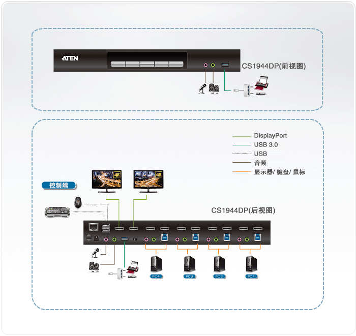 ATEN CS1944DP桌上型KVM多电脑切换器帮助您有组织的规划工作桌面空间。尤其是当您管理一个多媒体服务器工作站时,CS1944DP能帮助您通过单一USB键盘、鼠标、和两个DisplayPort接口屏幕,快速切换操作4台电脑,以便有效率的进行多工处理工作。