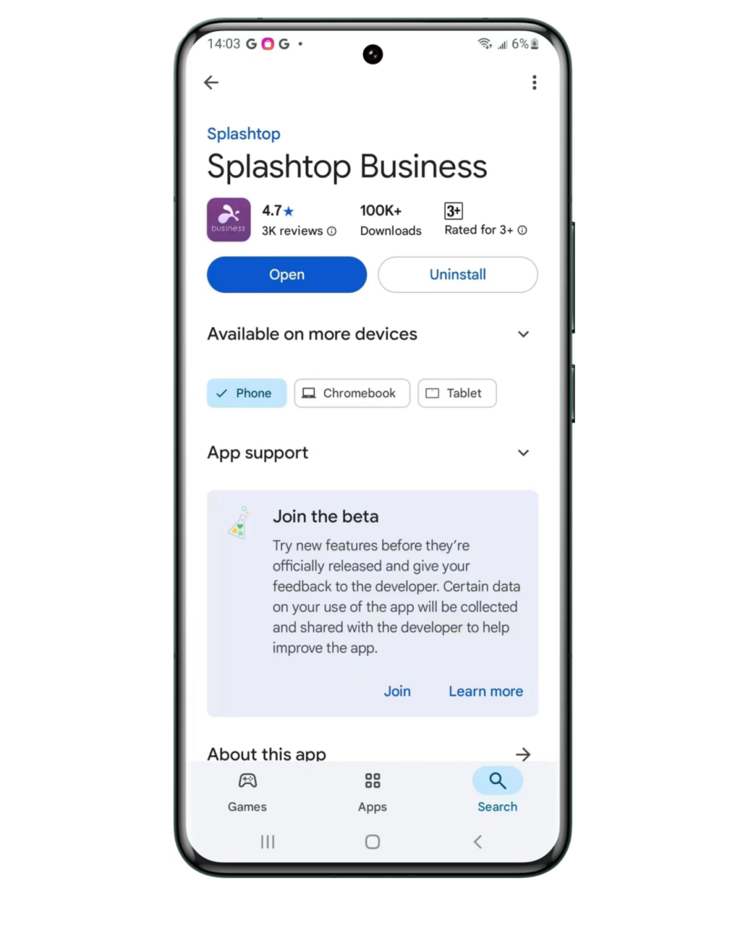 - 通过 Google Play(需网络支持)搜索下载“Splashtop”,认准官方开发者“Splashtop Inc.”。