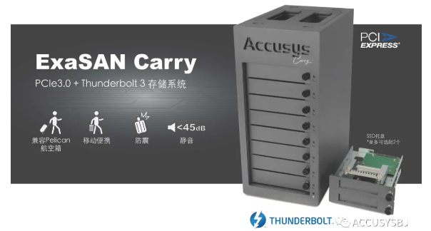 ExaSAN Carry 是 Accusys 全新设计的雷电 3 和 PCIe3.0 双端口存储系统。它防震、移动便携、静音,适用于音视频后期制作或前期拍摄现场 DIT( Digital Imaging Technician - 数字影像工程师)及有便携式存储需求的用户。