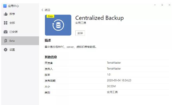 TOS应用市场- beta-Centralized Backup(中央备份), 点击“安装” 即可。