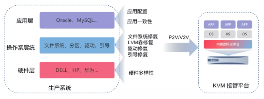 由于用户生产系统的复杂性,要做到在硬件层兼容多种硬件品牌、操作系统层完成文件系统修复、驱动修复的正确性以及应用层保持应用与生产系统的一致性非常具有挑战性。其次,在虚拟容灾主机配置时手动配置项多,容易造成配置错误或不恰当的配置;在虚拟容灾主机修复时手动操作繁琐,RTO时间延长,并且修复操作比较专业,对于一般人员来说无法做到快速准确修复。